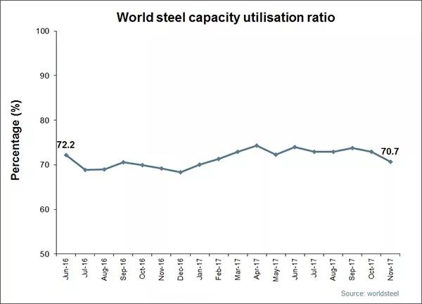 2017年11月全球66個納入世界鋼鐵協(xié)會統(tǒng)計國家的粗鋼產(chǎn)量為1.363億噸,同比提高3.7%;粗鋼產(chǎn)能利用率為70.7%,同比提高1.5個百分點,環(huán)比下降2.2個百分點。