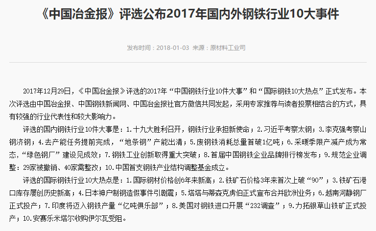 2018年1月3日,工業(yè)和信息化部在官網(wǎng)上刊出《<中國(guó)冶金報(bào)>評(píng)選公布2017年國(guó)內(nèi)外鋼鐵行業(yè)10大事件》一文,對(duì)《中國(guó)冶金報(bào)》評(píng)選的2017年“中國(guó)鋼鐵行業(yè)10件大事”和“國(guó)際鋼鐵10大熱點(diǎn)”進(jìn)行了介紹。